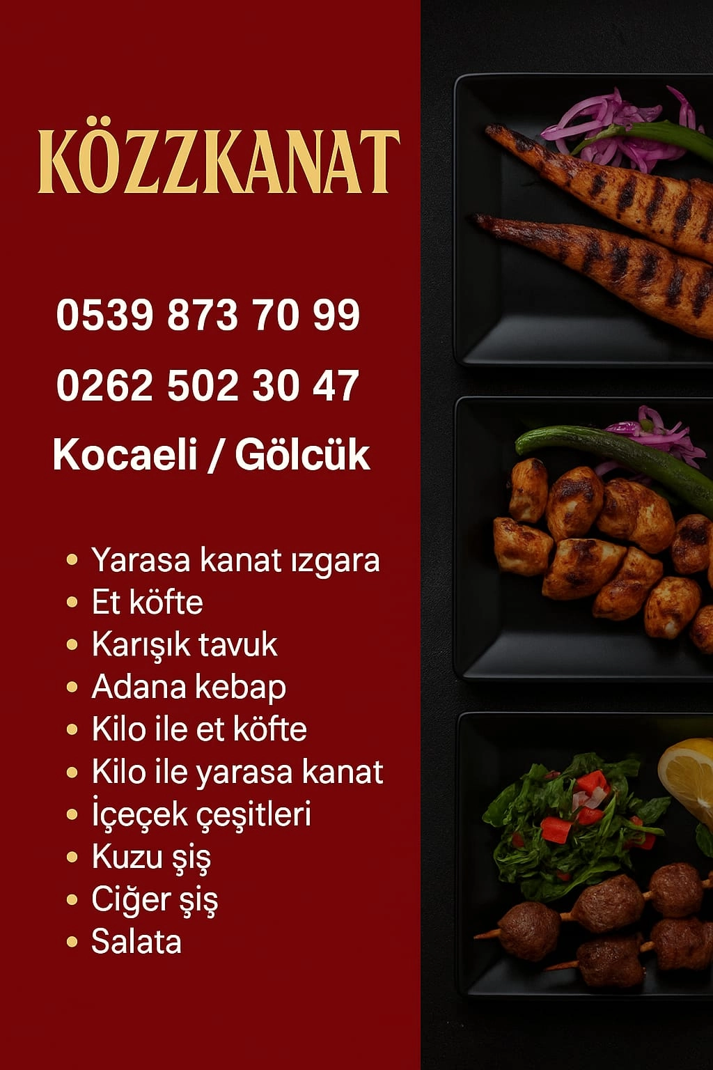 Gölcük, lezzetli ve zengin mutfağı ile özellikle et ve tavuk ürünleri konusunda öne çıkmaktadır. Tavuk ızgara, et köfte, Adana kebap ve farklı şiş çeşitleri, hem hızlı hem de lezzetli yemek arayanlar için ideal seçenekler sunmaktadır.Gölcük tavuk ızgara satış ve sipariş hizmetleri**, hem restoranlarda hem de evlere servis seçenekleriyle müşterilere ulaşmaktadır. Taze ve kaliteli malzemeler kullanılarak hazırlanan tavuk ızgara, lezzeti ve doyuruculuğu ile öne çıkmaktadır.Gölcük tavuk kanat siparişleri**, özellikle davetler ve özel günlerde tercih edilmektedir. Baharatlı ve marineli seçeneklerle hazırlanan tavuk kanatlar, hem lezzetli hem de pratik bir atıştırmalık veya ana öğün alternatifi sunmaktadır.